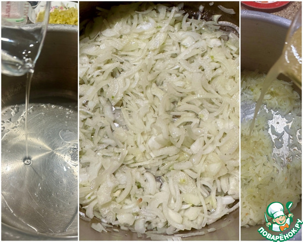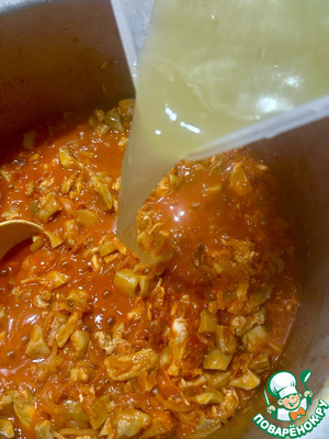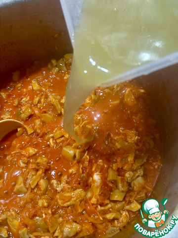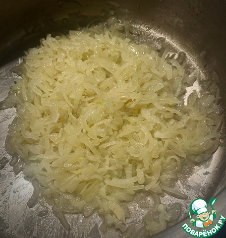 Как только лук хорошо прогреется, добавил толику бульона. Скорее даже жирок сверху бульона взял и добавил.