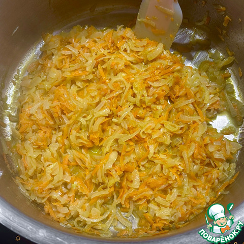 А дальше опять вопрос совершенно из личной отсебятины. Да. Морковку в солянку не кладут. Но! Мне нравится, когда она там есть, поэтому немного морковки к луку добавляю и в том же режиме, по той же технологии …