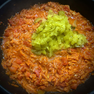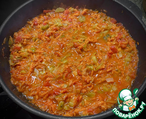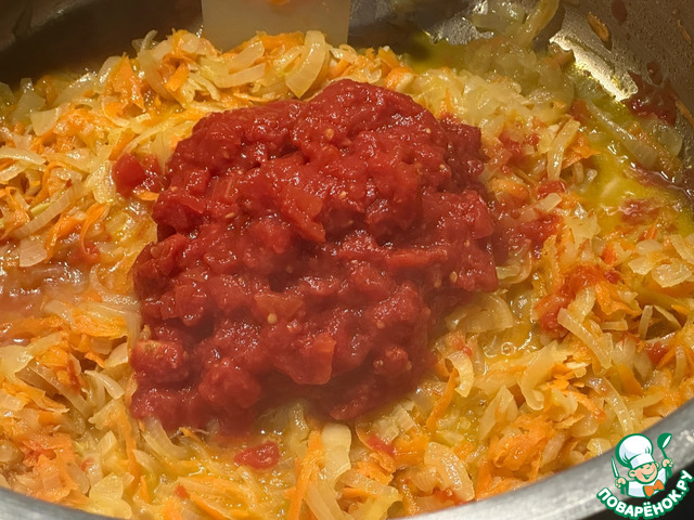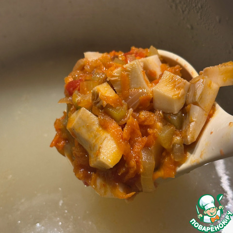 И в сковороду их. Перемешал деликатно и на несильном огне потушил. Задача привести заправку к мягкому такому вкусу, без резкостей и кислости помидорной. Жидкость излишнюю выпарить. Не забывайте постоянно помешивать. Не приведи, Создатель, подгорит. Испортите весь суп. Насовсем.