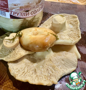 Итак, грибы. У меня грузди солёные. Но не сам солил, поэтому уксус в маринаде этих грибов имеет место. Причем в довольно немалом количестве. Поэтому грибы я хорошо промыл.
