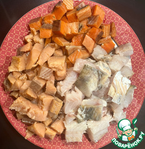 И семужки тоже слабосоленой приготовил. Граммов по двести просто солёной и подкопчённой. Такими же кусочками нарезал.