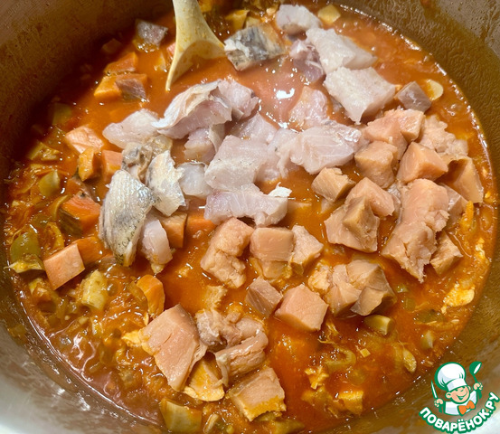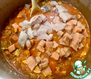 Да рыбе чуть прогреться и залил основу - заправку бульоном. Опять же, не устану повторять - деликатно (!) перемешал содержимое кастрюли.