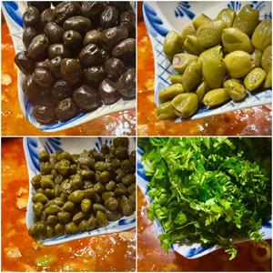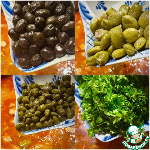 А потом в кастрюлю отправились маслины, оливки, каперсы и зелень.