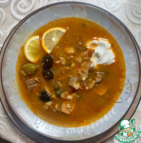 Нет, не «опять солянка», а снова Солянка! Если подходить строго, то это, конечно, даже исходя из моих рассказов про солянку что я публиковал - не просто баян, а такой (!!!) БАЯНИЩЕ!!! Но, товарищи, у меня есть оправдание. И даже не одно. Во-первых, скоро Старый Новый год, а это праздник - застолье и для многих застолье это в году один из самых главных. И наутро … Вот на утро - такая соляночка наиправейшее (ну после кислых щей, конечно) дело. А, во-вторых, я, например, не встречал на этой Земле человека, вне зависимости от национальности, цвета кожи, места проживания, вероисповедания, величины, или просто наличия банковского счета… и т. д., который бы сказал, отведавши этого супчика, что «СОЛЯНКА – это плохо». Ну не встречал!!! Может быть, я просто не в тех местах хожу и не с теми человеками общаЮся?! Но, тем не менее – СОЛЯНКА РЫБНАЯ СБОРНАЯ. Эту часть текста люди, которым история, в принципе неинтересна, могут пропустить: Пару слов об этимологии названия, чтобы предвосхитить мнения всевозможных знатоков. Слова все не мои, взяты с просторов, так сказать. «…Селянки были самыми популярными супами после щей, борщей и рассольников. В XIX веке селянка могла быть не только супом, но и горячей закуской на основе кислой или свежей тушеной капусты, подаваемой на сковородке перед супом или после, — перед мясным блюдом. В разбираемом случае это был заправочный суп на крутом мясном, рыбном или грибном бульоне с острыми приправами. Есть мнение, что «селянка — неправильное, искаженное, но укоренившееся с XIX века в поваренных книгах и меню наименование солянок». Известный публицист русской кухни Н. И. Ковалев писал в 1980-х годах: «Наиболее острыми русскими заправочными супами являются солянки. Однако спор об их названии идет до сих пор. Одни считают, что их надо называть «солянками», поскольку в них входят соленые огурцы, другие – «селянками», от слова «сельский», так как это, мол, деревенское блюдо в отличие от разных бульонов — ух. С кулинарной точки зрения их правильнее называть солянками, так как в быту русских крестьян щи да супы с крупами были основными жидкими блюдами и никаких селянок они не готовили. В ранних источниках встречаются только солянки рыбные и грибные (из соленых рыжиков и других грибов), а мясные солянки вошли в кулинарию только в XIX веке». Известный лингвист Л. И. Скворцов пишет о традиционности названия «селянка» и неясности этимологии слова «солянка». В 1990-х Н. И. Ковалев изменил своё мнение: «Солянка … такого блюда нет в нашей кухне. Писатель Б. Полевой пишет, что есть трава солянка, растущая на солончаках, есть в Москве старинная улица Солянка, а блюдо называется селянка, то есть по-деревенски, по-сельски сытное и без затей». В другом издании: «Одно бесспорно: старинное русское название этого блюда – «селянка», и менять его нет оснований. В поваренных книгах XVIII века упоминается только рыбная селянка….» В старых поваренных книгах, кстати, везде тоже «сЕлянка». Но раз сОлянка людЯм привычнее, то я так и оставлю, через «О». Описаний «как надо» в отношении этого супа великое множество, но принцип, в общем, схож.