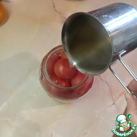 Горячим рассолом залить помидоры.