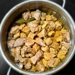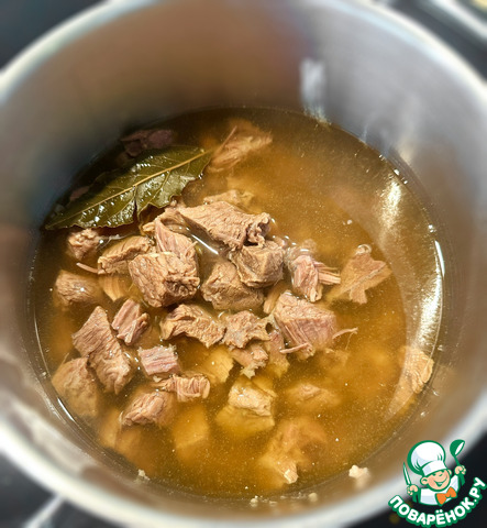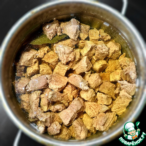 Я просто залил водой - «на два пальца», что называется, чуток присолил, добавил перцев и лаврушку. И на огонь. Довел до кипения. Дождался, пока перестала выделяться пена, убирая ее, конечно, и на минимальный нагрев. Под крышку.