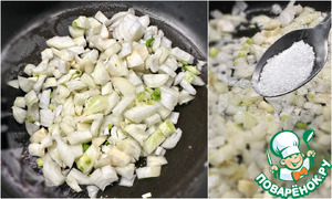 Головку лука среднего размера изрубил, говоря в стиле Елены Ивановны Молоховец, и, купая его, лук в хорошо прогретом растительном масле, довел до предпрозрачности. Надо выпарить эту луковую остроту и резкий аромат.