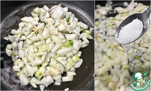 В процессе добавил четверть чайной ложки сахара. Для ускорения и более качественной карамелизации лука.