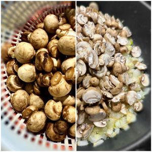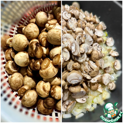 Шампиньоны. Хорошо промыть — это обязательно. У меня некрупные были, поэтому порезать хватило просто пополам.