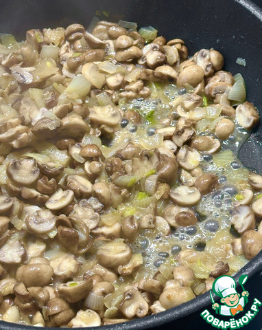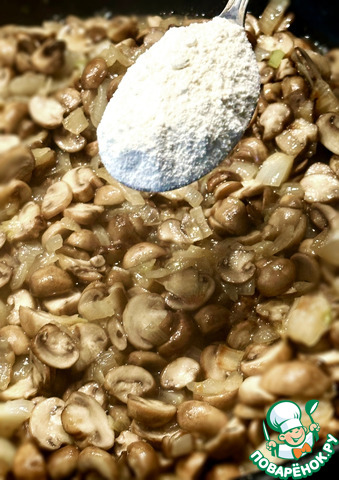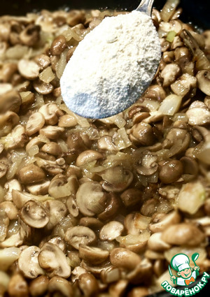 Столовая ложка «с хорошим верхом» муки. К грибо - луковой смеси. И тщательно перемешивая, несколько минут эту смесь прогревал. Чтобы слегка подрумянилось.