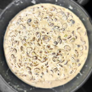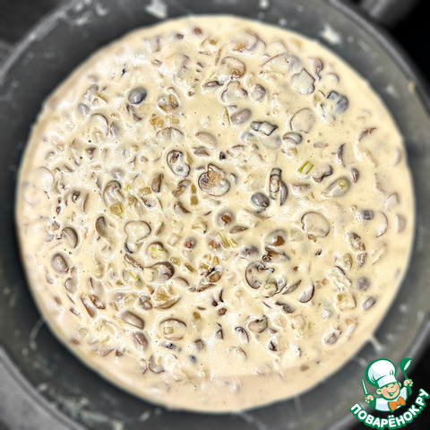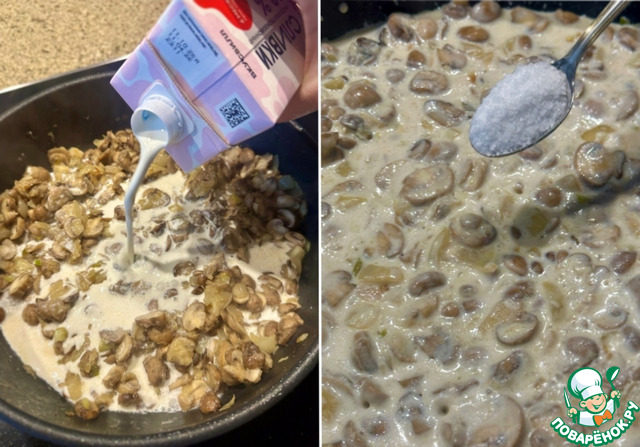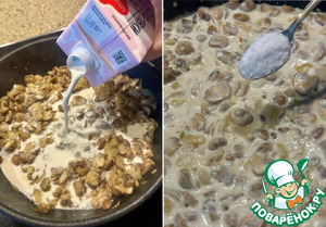 Пакетик (триста граммов) сливок. У меня были 10%. Вливал порциями, постоянно перемешивая содержимое сковороды. Очень важно, перемешивая, контролировать, чтобы ничего не прилипало к днищу сковороды. Если что-то подгорит, считай - всё пропало, начинай с начала.