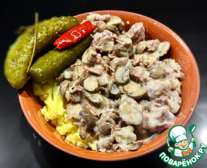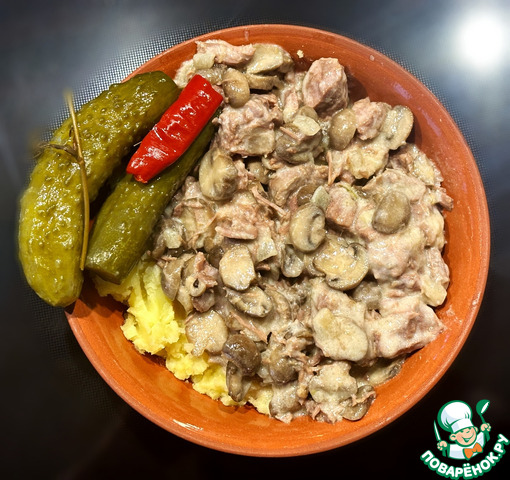 Если говорить в бытовом, так сказать разрезе, или в стиле, что ли, наших домашних кухонь — это скорее «мясо с грибо-сливочной подливой». Ибо «соус», он, в общем, нечто другое подразумевает. Нам нравится такое мясо в подливке с картофельным пюре. Хотя, уверяю, что и с макаронами, и с гречкой и прочим … такое вот мясо с такой вот подливой будет уместно, вкусно и …, в общем, приготовьте и сами убедитесь.