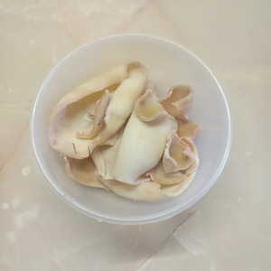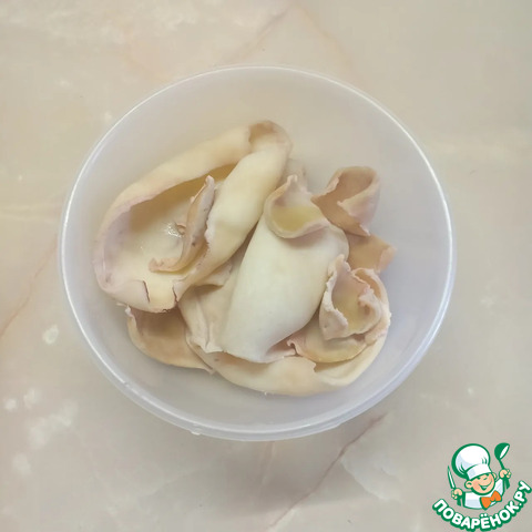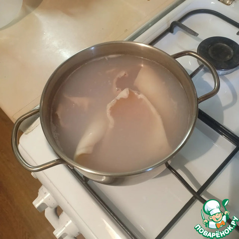 Очистить тушки кальмаров от внутренностей, положить в кипящую подсоленную воду на 2-3 мин (пока они не побелеют и шкурка не свернется).