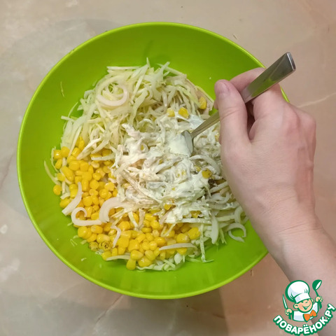 Кукурузу выложить в глубокую миску или салатник. Туда же выложить нарезанные кальмары, капусту и лук. Добавить майонез, соль и перец.