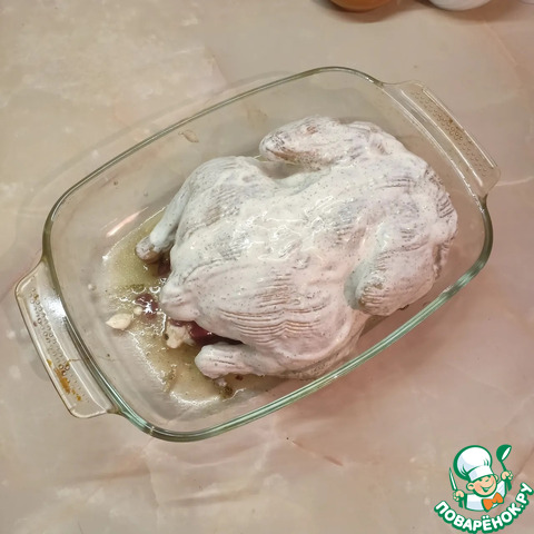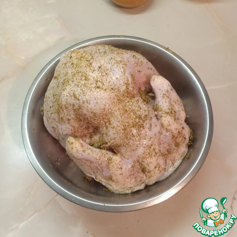 Тушку натереть солью, перцем, хмели-сунели и измельченным чесноком.
