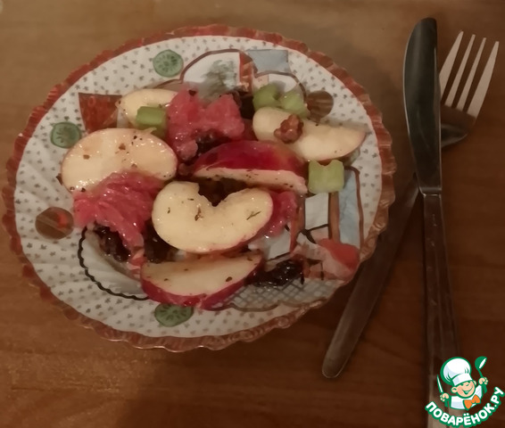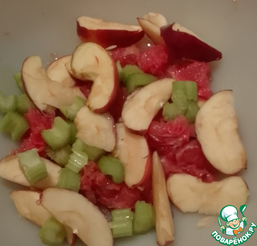В салатницу выложить яблоки, кусочки грейпфрута и сельдерей. -