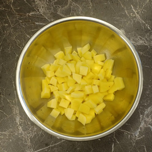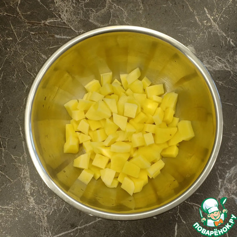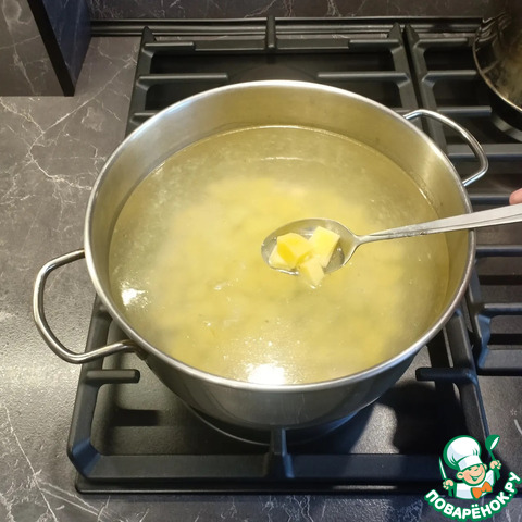 Добавить в кастрюлю соль, выложить нарезанный картофель и проварить суп 10мин.