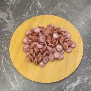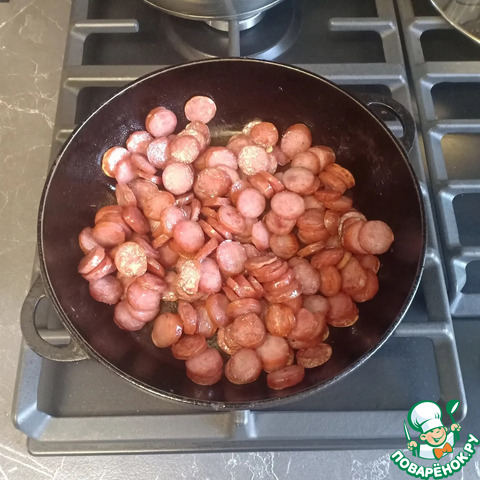 Затем, на этой же сковороде, отдельно обжарить колбаски до румяности.