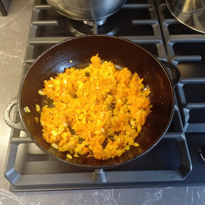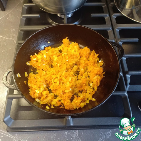 На хорошо разогретой сковороде обжарить лук с морковью и чесноком до золотистого цвета.