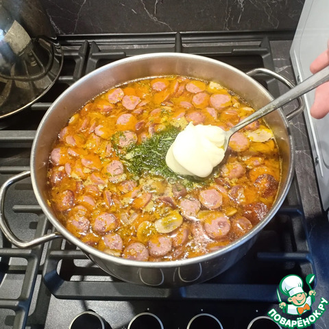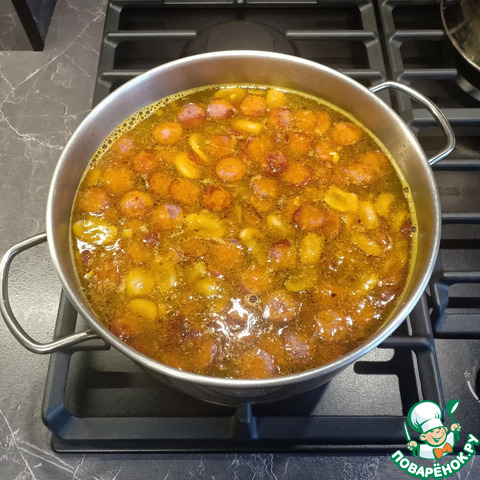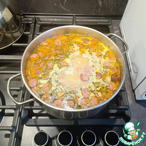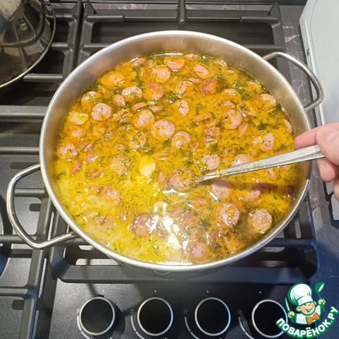 Затем добавить в нее обжаренные грибы, колбаски, лук с морковью и варить еще 10мин.