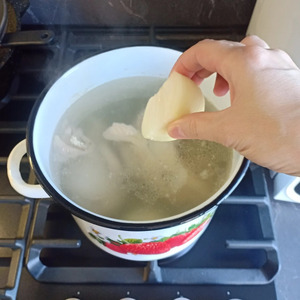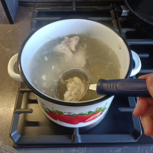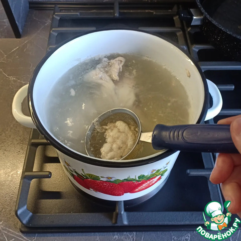 Как только мясо закипит, снять с бульона образовавшуюся накипь.