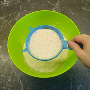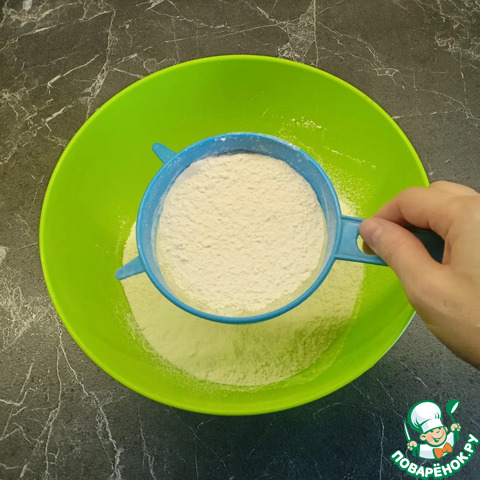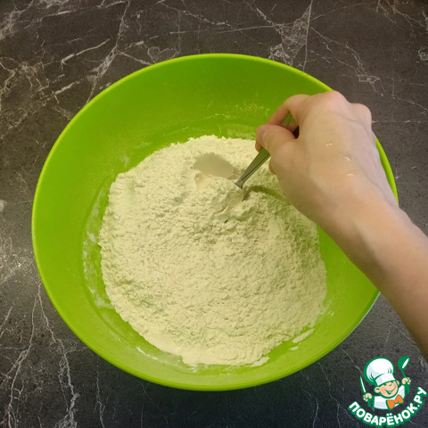 Пока варится мясо, замесить тесто. Муку просеять в большую глубокую миску.