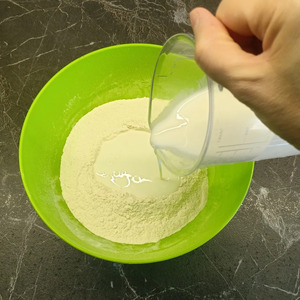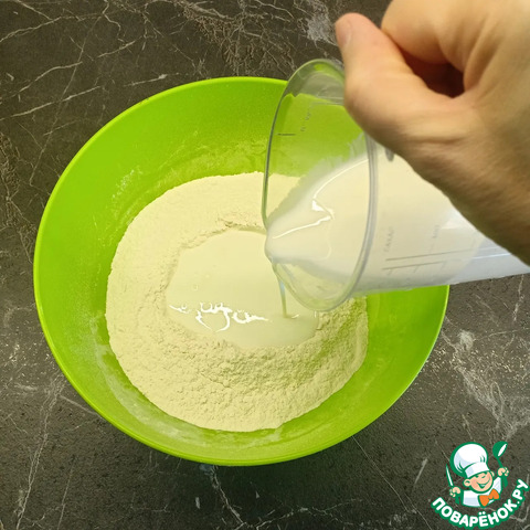 Затем тонкой струйкой влить кефир.