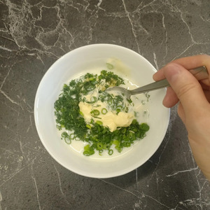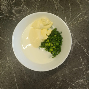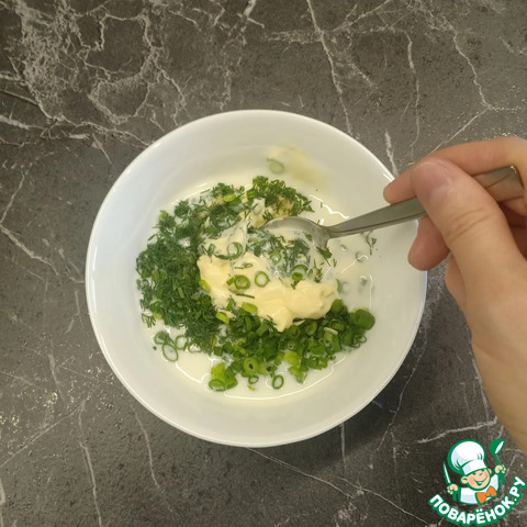 В глубокую мисочку выложить измельченные чеснок и зелень.