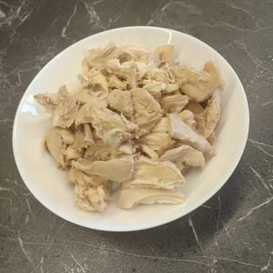 Готовое куриное мясо выложить на тарелку и дать ему немного остыть, а затем отделить мясо от костей и нарезать его средними кусочками.
