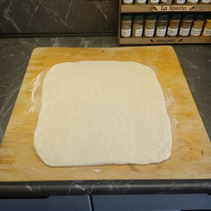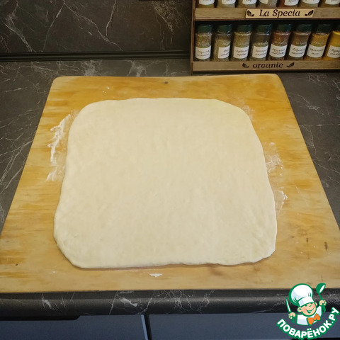 Расстоявшееся тесто раскатать в пласт толщиной 6-10мм.