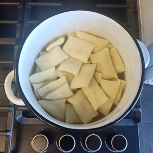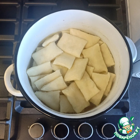 Куриный бульон снова довести до кипения, выложить туда хинкал и варить 5-7мин до готовности. Готовый хинкал должен увеличиться в размерах и слегка расслоиться по срезам.