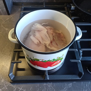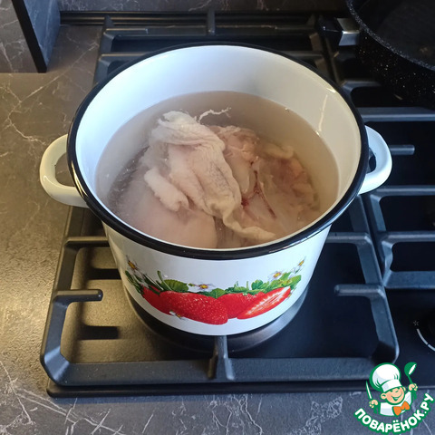 Куриное мясо хорошо промыть, уложить в кастрюлю, залить его водой и поставить вариться на средний огонь.