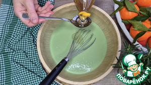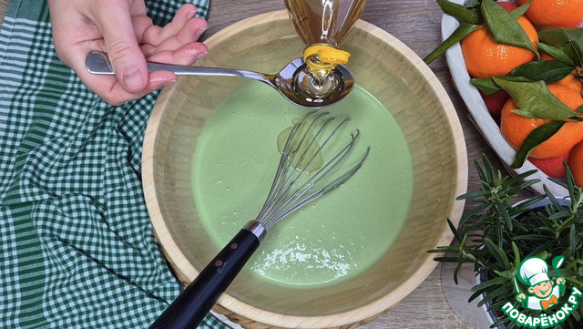 Ещё я добавила немного зелёного красителя, но это не обязательно. И в конце растительное масло. Перемешать и тесто готово.