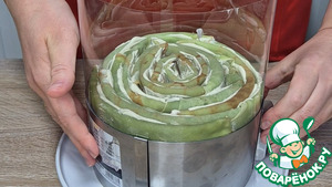 Фиксируем торт кольцом и в холодильник на 5 часов минимум. Я оставляла на ночь.