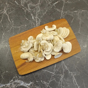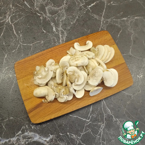 Очищенные шампиньоны нарезать слайсами.