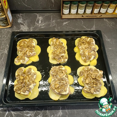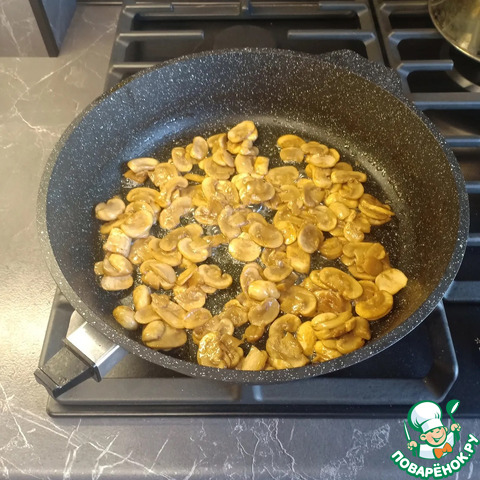 Сверху на мясо выложить слой из обжаренных шампиньонов.