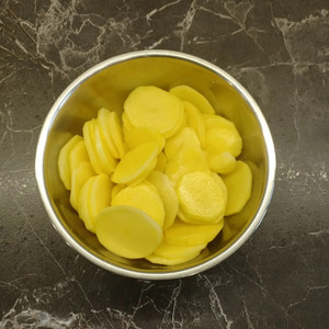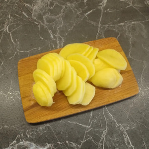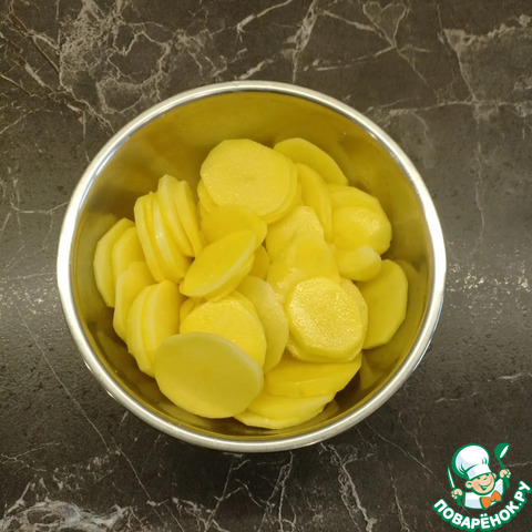 Картофель очистить и нарезать кружочками толщиной 2-4 мм.