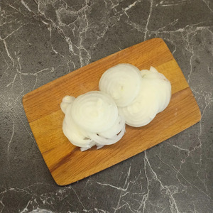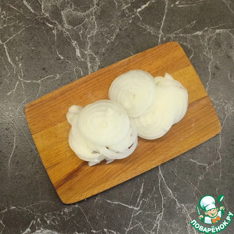 Лук очистить и нарезать тонкими кружочками. По желанию, лук предварительно можно слегка обжарить до мягкости.