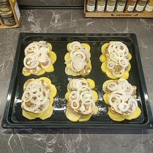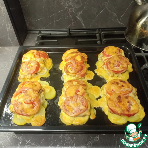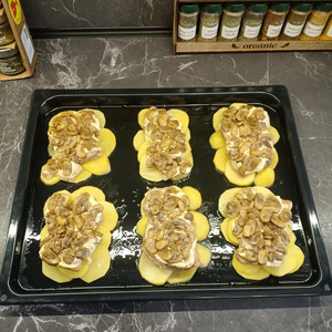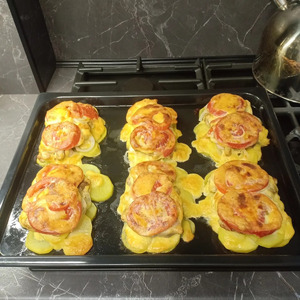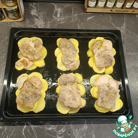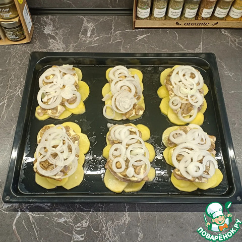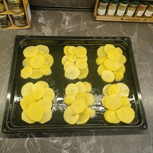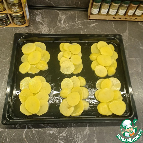Противень смазать маслом и выложить на него кружочки картофеля овалами, образуя отдельные порции.