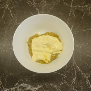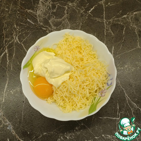Для сырной шапочки натереть сыр на мелкой терке, добавить в него яйцо, 2ст. л. майонеза и хорошо все перемешать до однородного состояния.