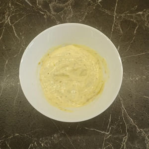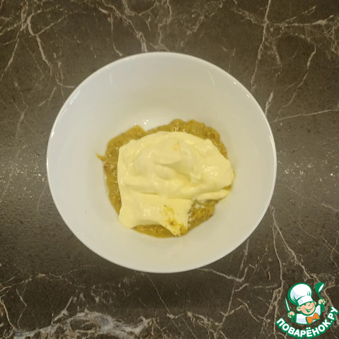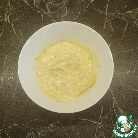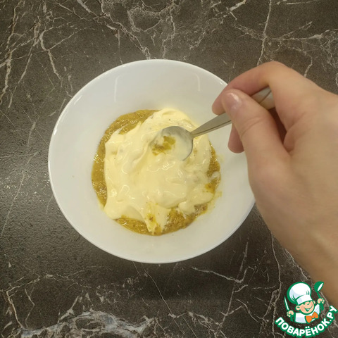 Для соуса смешать майонез и горчицу из расчета 1ст. л. майонеза (без верха) и 1/3ч. л. горчицы на 1 порцию.