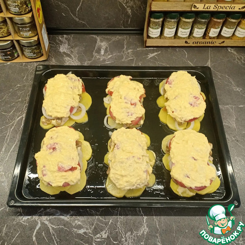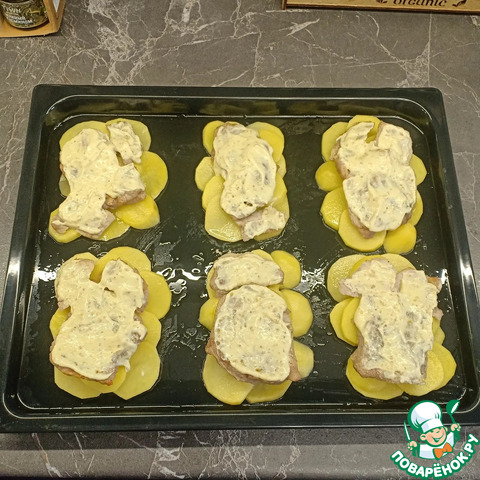 Готовым соусом смазать мясо, уложенное на картофель.