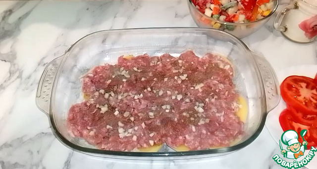 Вторым слоем выложите фарш. Посолите и поперчите его, добавьте любимые специи (у меня кориандр), посыпьте чесноком.