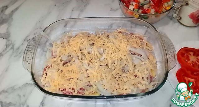 Далее, выложите лук и посыпьте его половиной сыра.