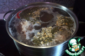 Мясо залить водой, довести до кипения, снять пену, добавить коренья, букет Гарни, убавить огонь до среднего и варить 2,5 часа. За полчаса до готовности посолить.