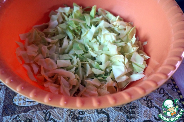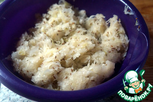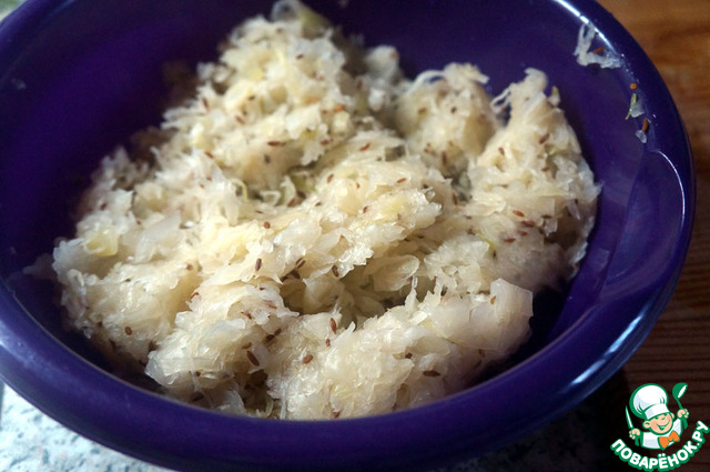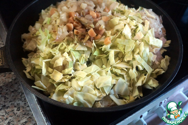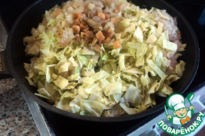 В сковороде разогреть топленое масло, отправить обе капусты, добавить маринованный чеснок, тушить на малом огне до мягкости капусты.