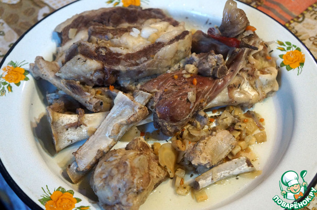 Готовое мясо вынуть, шумовкой вынуть коренья (можно бульон процедить, но я посчитал это лишним), мясо снять с костей.