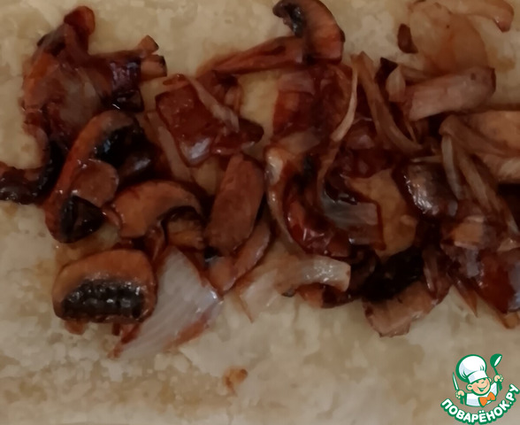 Разогреваем духовку до 220С. Делим слоёное тесто на два прямоугольника. Выкладываем каждый прямоугольник на пекарскую бумагу и готовим слоёное тесто 3-5 минут. Тесто должно слегка подняться и приобрести лёгкий золотистый оттенок. На каждый прямоугольник тонким слоем выложить карамелизированную грибно-луковую смесь. -