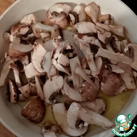 Добавить половину нарезанных грибов и жарить 10 минут до мягкости и испарения выделяемой жидкости.