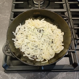 В сковороде на среднем огне растопить сливочное масло, выложить туда лук и немного обжарить его.